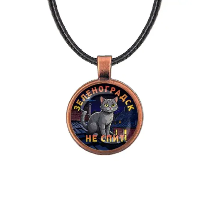 Кулон из бижутерного сплава с покрытием под медь и стеклянной линзой, с изображением «Зеленоградск не спит».