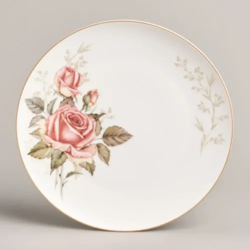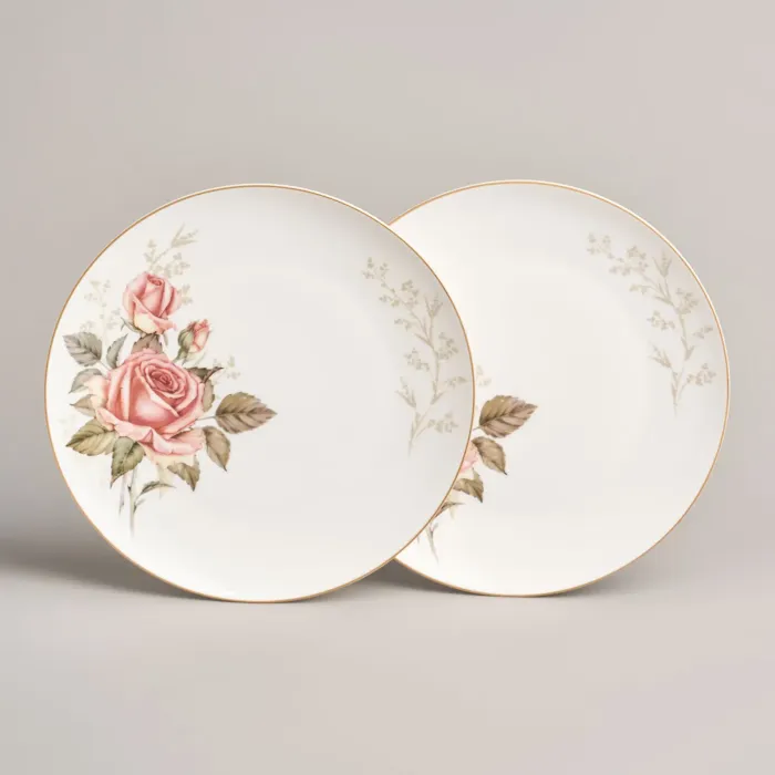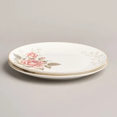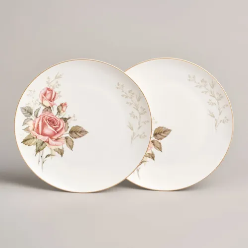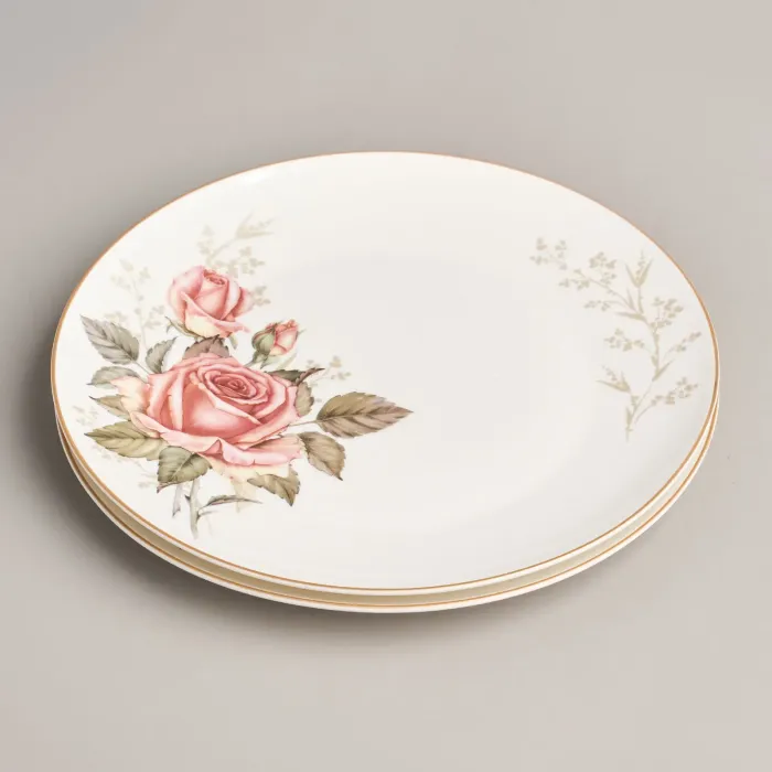 Тарелки изготовлены из фарфора, материала, известного своей прочностью и гигиеничностью. Поверхность украшена рельефной деколью с изображением розы, а край тарелки оформлен декоративной полосой. Набор поставляется в подарочной коробке.