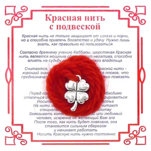 Красная нить на Удачу (Клевер),цвет сереб, металл, шерсть AN0092