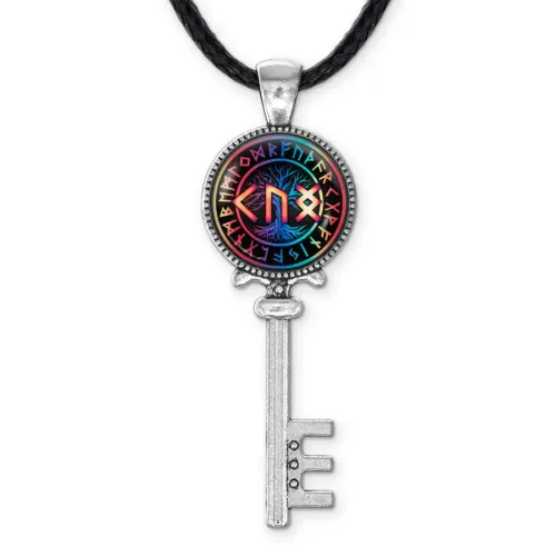 Кулон-амулет из бижутерного сплава под серебро с изображением рун под выпуклой стеклянной линзой.