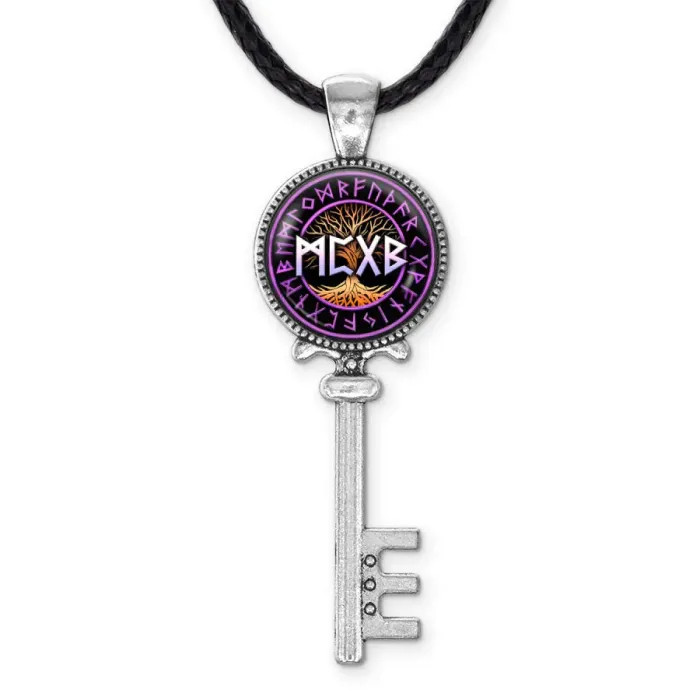 Кулон-амулет из бижутерного сплава под серебро с изображением рун, защищённым выпуклой стеклянной линзой.