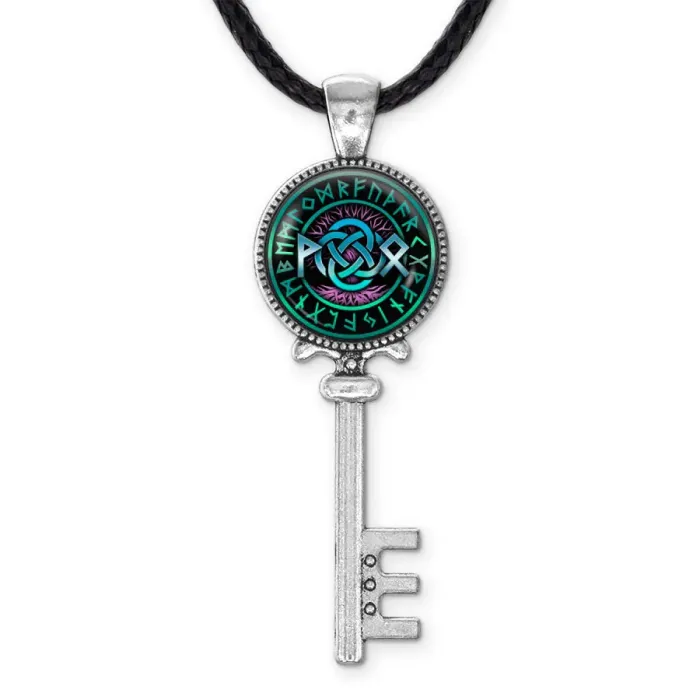 Кулон-амулет из бижутерного сплава под серебро с изображением кельтского узла под выпуклой стеклянной линзой.