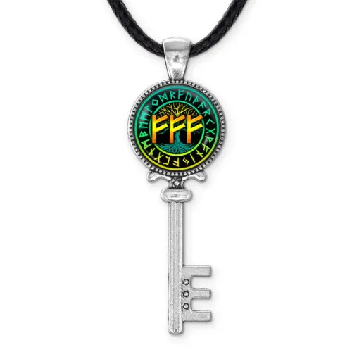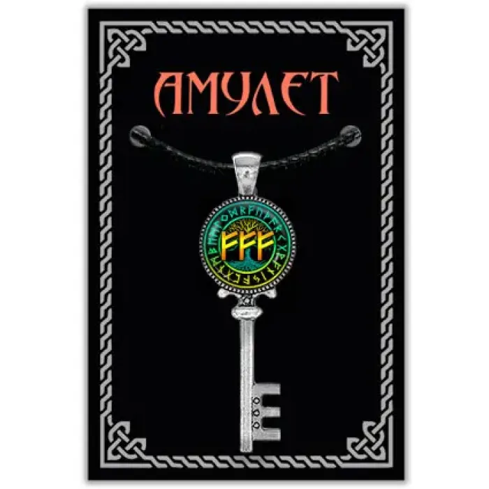 Кулон-амулет «Материальное благополучие» из бижутерного сплава под серебро с изображением рун Феху под стеклянной линзой.