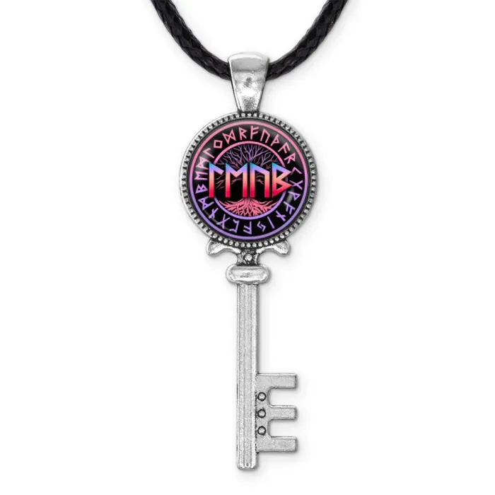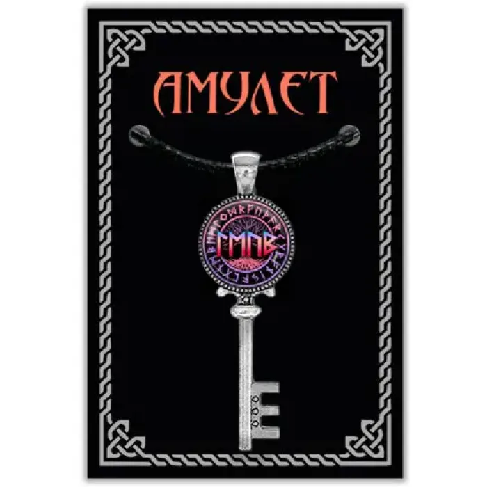 Кулон-амулет из бижутерного сплава под серебро с изображением рун, защищённым выпуклой стеклянной линзой.