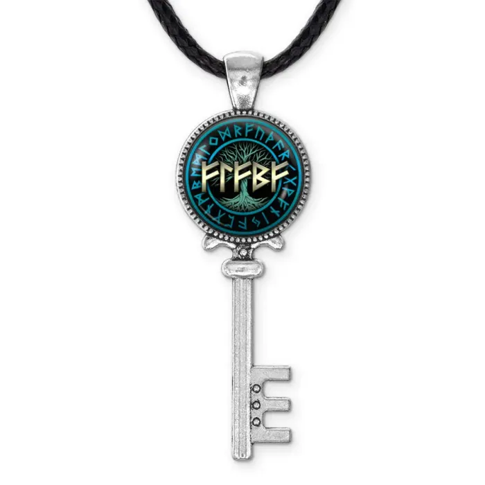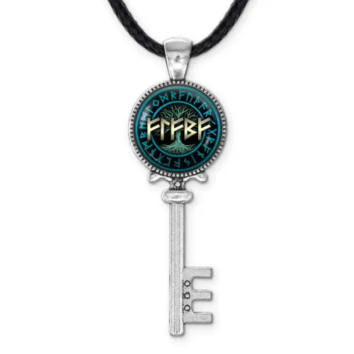 Кулон-амулет из бижутерного сплава под серебро с изображением рун под выпуклой стеклянной линзой.