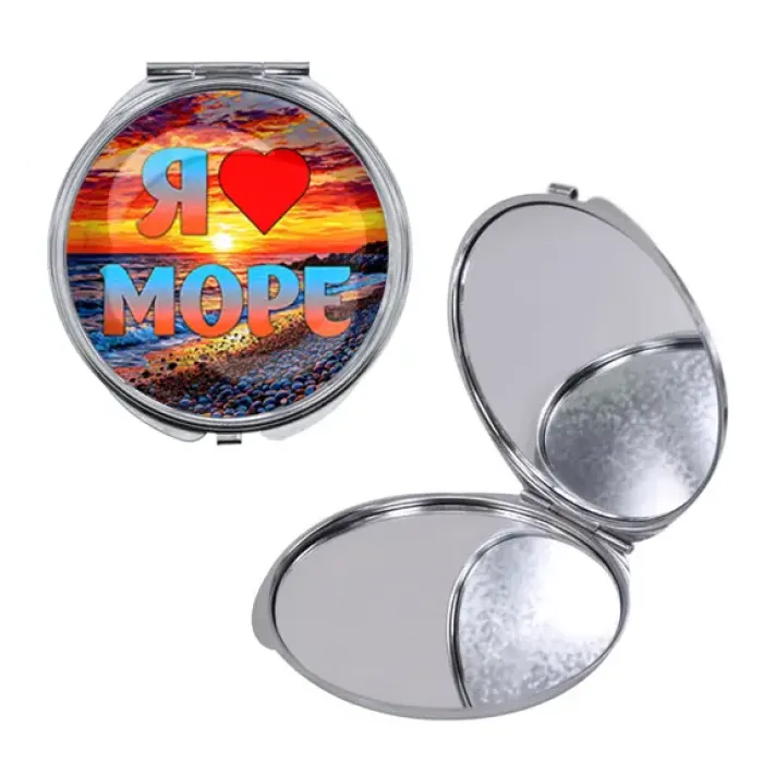 Косметическое складное зеркало круглой формы из металла и стекла с полноцветным принтом «Я люблю море».