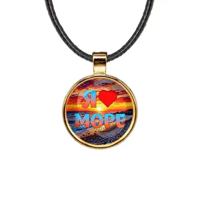 Кулон «Я люблю море» из бижутерного сплава с покрытием под золото и стеклянной линзой.