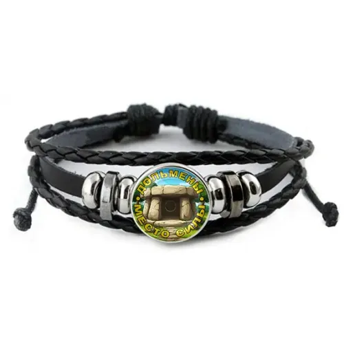 Кожаный браслет с изображением дольменов под выпуклой стеклянной линзой.