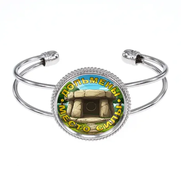 Браслет из бижутерного сплава с изображением дольменов. Изображение защищено выпуклой стеклянной линзой.