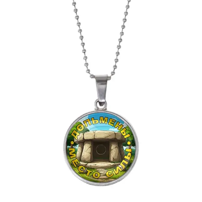 Кулон с цепочкой из бижутерного сплава с серебряным покрытием и стеклянной вставкой. Дизайн с изображением дольменов.
