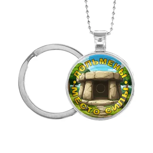 Кулон-брелок «Дольмены - место силы» из бижутерного сплава с изображением под стеклянной линзой.