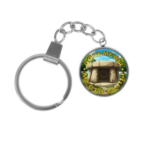 Брелок для ключей из нержавеющей стали с изображением дольменов под выпуклой стеклянной линзой.