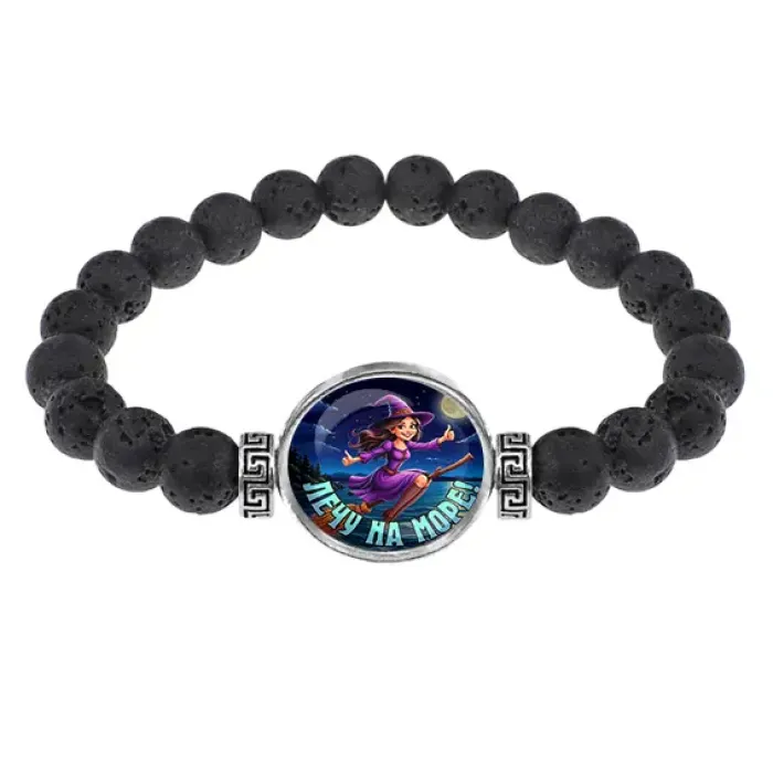Стрейч-браслет из натуральной лавы с изображением под выпуклой стеклянной линзой.