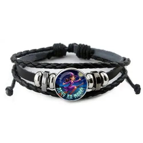 Кожаный браслет с декоративным элементом под стеклянной линзой.