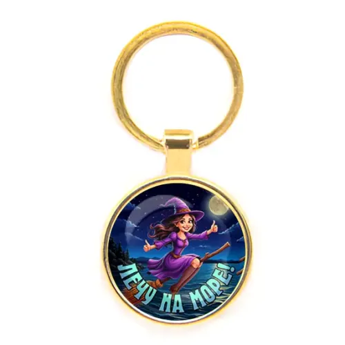 Круглый брелок из бижутерного сплава с надписью «Лечу на море». Изображение защищено выпуклой стеклянной линзой.