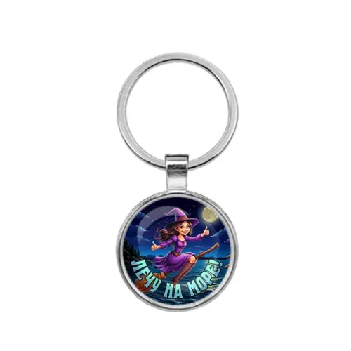 Круглый брелок из бижутерного сплава с изображением под стеклянной линзой.