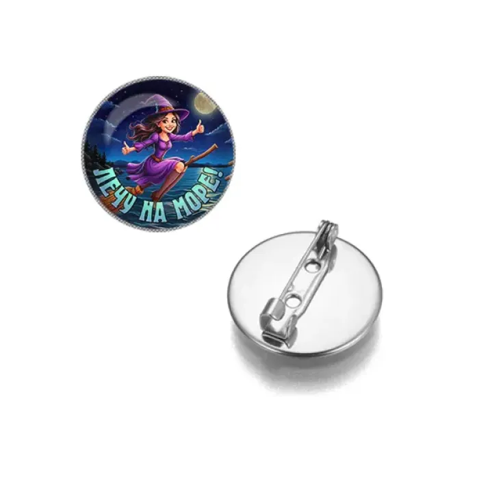 Круглый значок «Лечу на море» из бижутерного сплава с выпуклой стеклянной линзой.