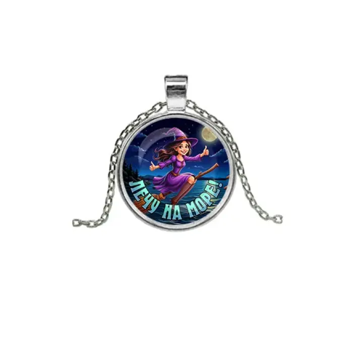Кулон с цепочкой, модель «Лечу на море». Изготовлен из бижутерного сплава с серебристым покрытием и стеклянной линзой.