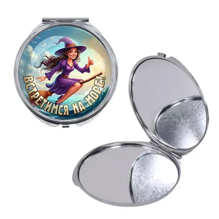 Складное зеркало круглой формы из металла и стекла с полноцветным принтом.