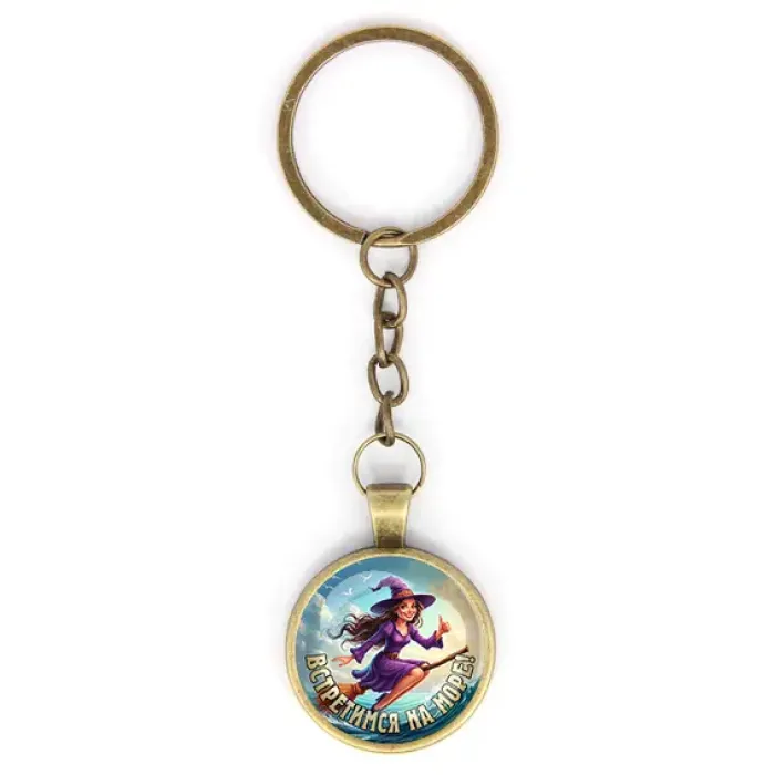 Круглый брелок с цепочкой и покрытием под бронзу. Изображение защищено выпуклой стеклянной линзой.