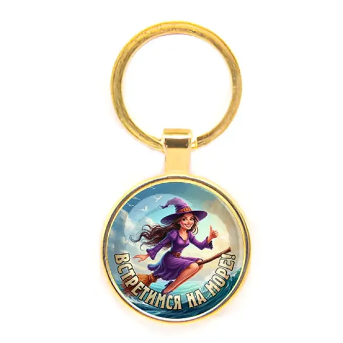 Круглый брелок с изображением и надписью «Встретимся на море». Материал — бижутерный сплав с золотым покрытием и стеклянной линзой.