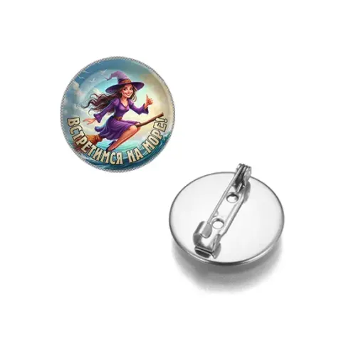 Круглый значок с изображением и надписью «Встретимся на море». Материал — бижутерный сплав с серебристым покрытием, защищён стеклянной линзой.