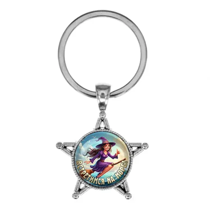 Брелок в форме звезды из бижутерного сплава под серебро со стеклянной линзой.