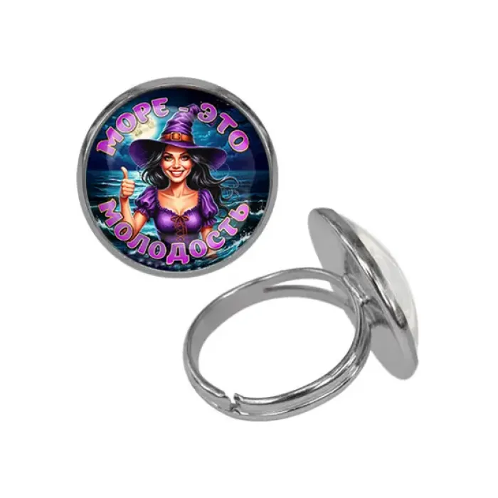 Кольцо из бижутерного сплава с покрытием под серебро. Имеет безразмерную конструкцию и изображение под выпуклой стеклянной линзой.