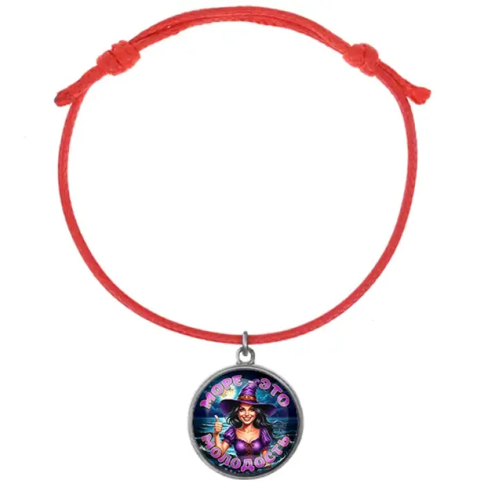 Браслет из красного шнура с металлической подвеской. Подвеска имеет полиграфическую вставку под выпуклым стеклом.
