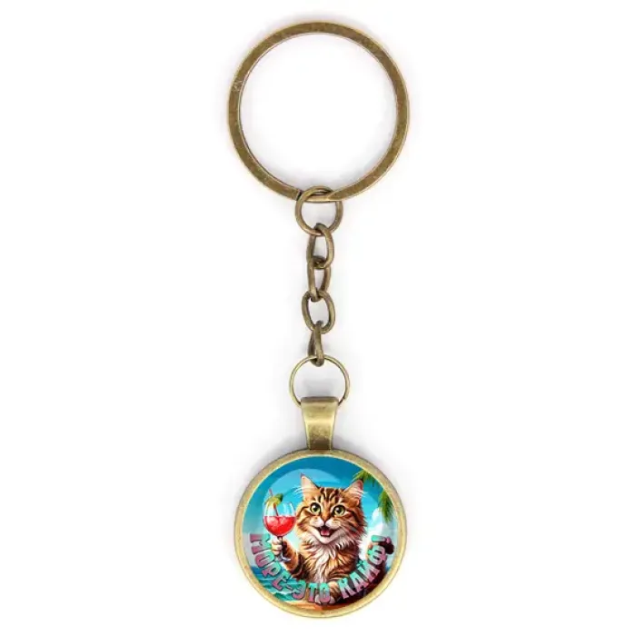 Брелок круглой формы с цепочкой, покрытие под бронзу, изображение защищено стеклянной линзой.