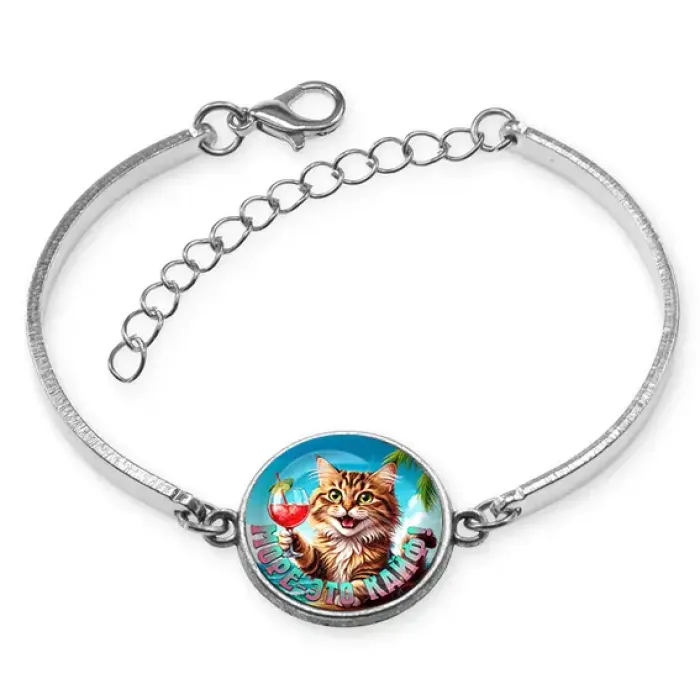 Браслет из бижутерного сплава с серебристым покрытием и декоративным элементом под стеклянной линзой.