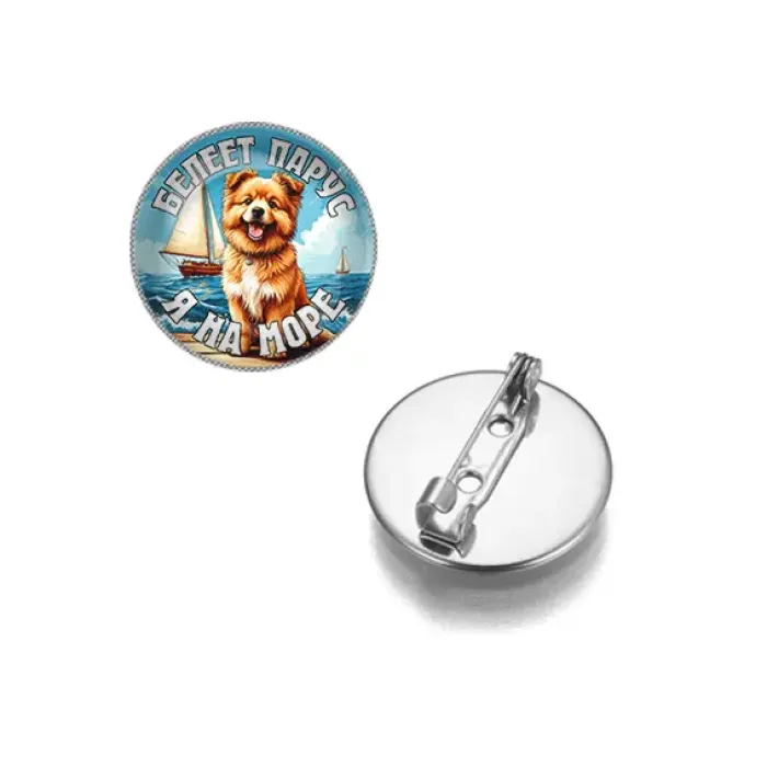 Круглый значок «Я на море» из бижутерного сплава с серебристым покрытием и выпуклой стеклянной линзой.