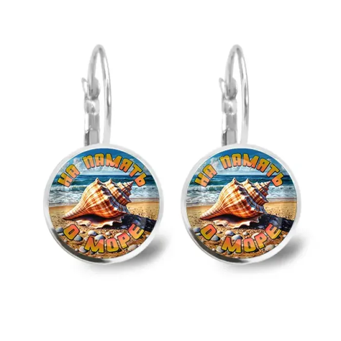 Серьги сувенирные из бижутерного сплава с изображениями под выпуклыми стеклянными линзами.