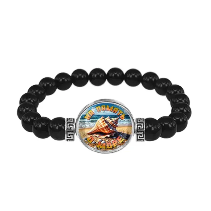 Материал и изготовление: Натуральный черный агат (бусины диаметром 8 мм). Декоративный элемент с изображением расположен под выпуклой стеклянной линзой на сеттинге из бижутерного сплава с покрытием под серебро.