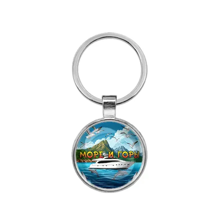 Круглый брелок из бижутерного сплава с серебристым покрытием и стеклянной линзой. На линзе размещено изображение «Море и горы».