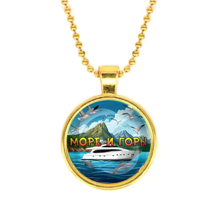 Кулон с цепочкой. Материал: бижутерный сплав с золотым покрытием и стеклянной линзой. Дизайн с изображением моря и гор.