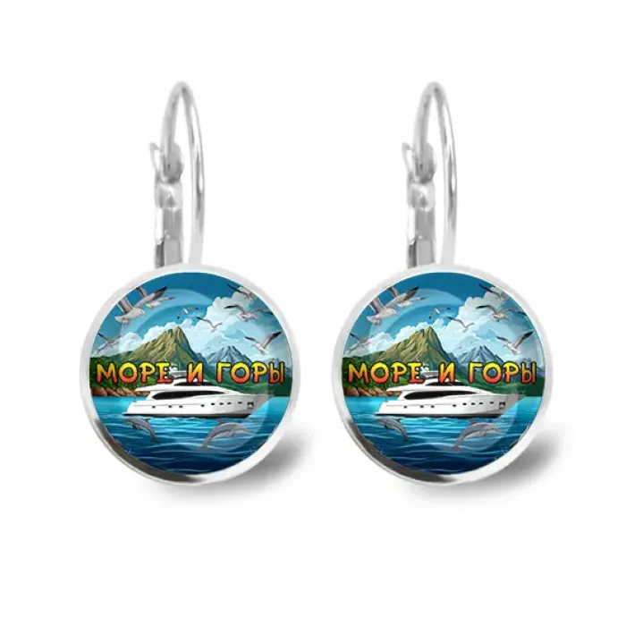 Серьги бижутерные с декоративными вставками под стеклом. Дизайн «Море и горы».