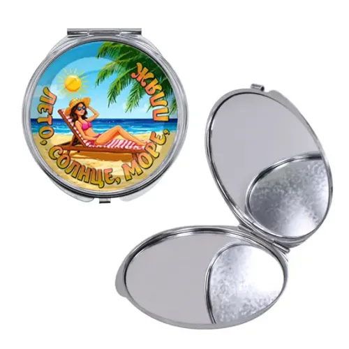 Круглое складное зеркало для косметических целей из металла и стекла с полноцветным принтом на тему летнего отдыха.