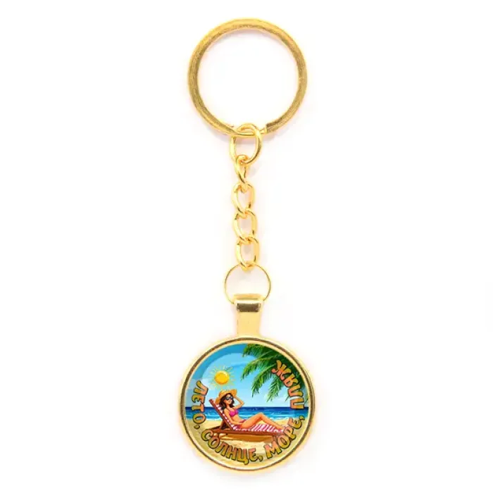 Круглый брелок из бижутерного сплава с золотым покрытием и стеклянной линзой. Дизайн посвящён летней и морской тематике.
