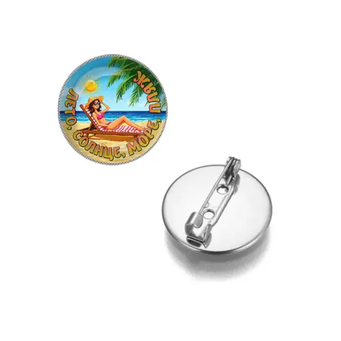 Круглый значок с изображением летнего пейзажа. Изготовлен из бижутерного сплава с серебристым покрытием и выпуклой стеклянной линзой.