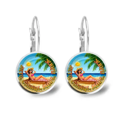 Серьги из бижутерного сплава с выпуклыми стеклянными линзами, изображающими летние мотивы.
