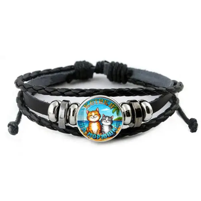 Браслет из искусственной кожи с круглым медальоном, на котором под выпуклой стеклянной линзой размещено изображение котиков на морском фоне. Аксессуар имеет регулируемую застежку.
