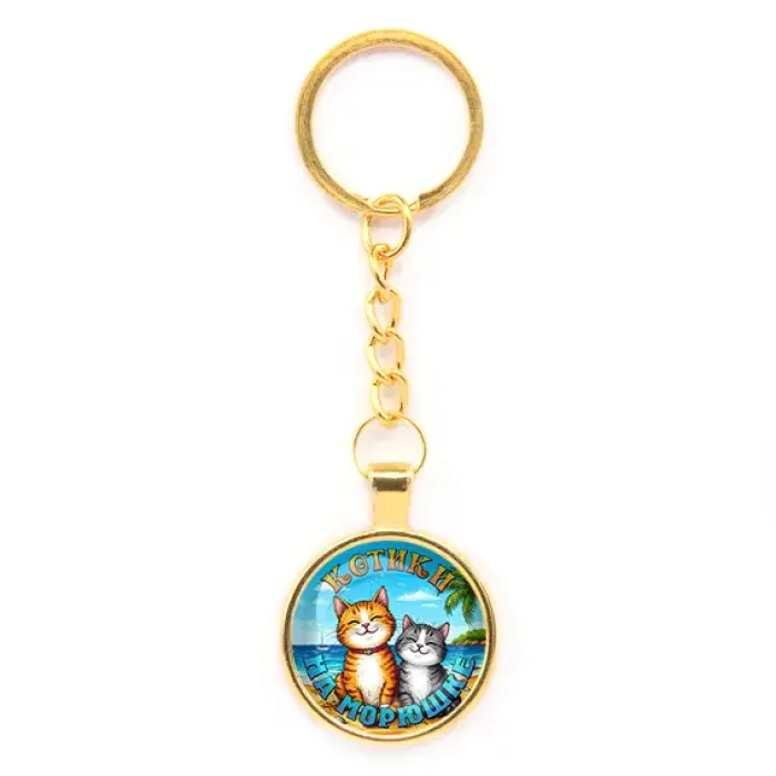 Круглый брелок из бижутерного сплава с изображением котиков на морюшке под стеклянной линзой.