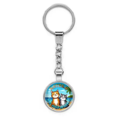 Круглый брелок из бижутерного сплава с изображением котиков на морюшке под выпуклым стеклом.