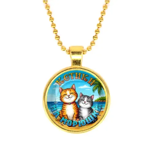 Кулон с цепочкой. Материал: бижутерный сплав с золотым покрытием и стеклянной вставкой под линзой. Дизайн: «Котики на морюшке».
