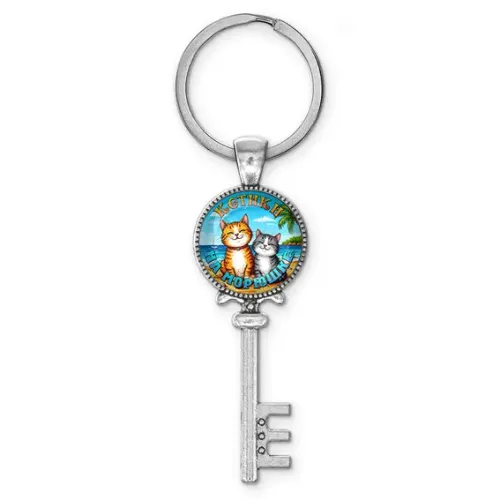 Брелок-ключ из бижутерного сплава с изображением котиков под выпуклой стеклянной линзой.