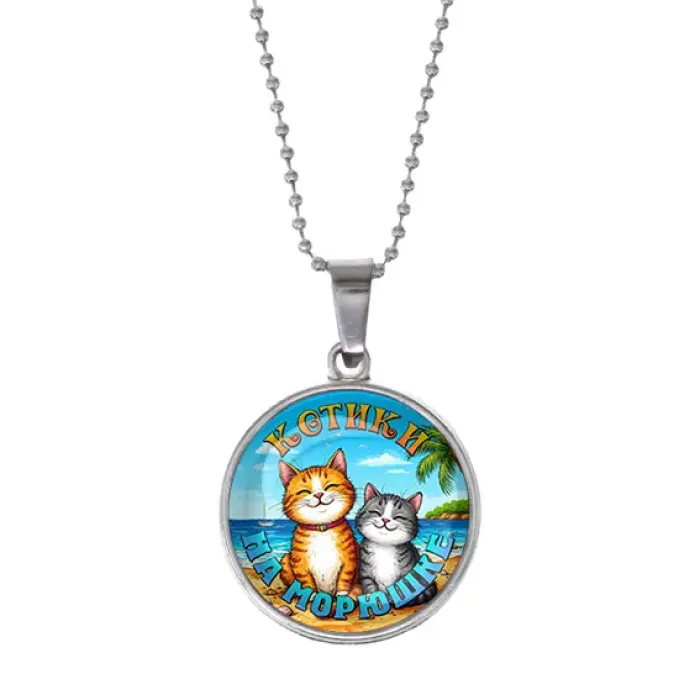 Кулон с цепочкой, цвет серебро. Изображение котиков на фоне моря под выпуклой стеклянной линзой.