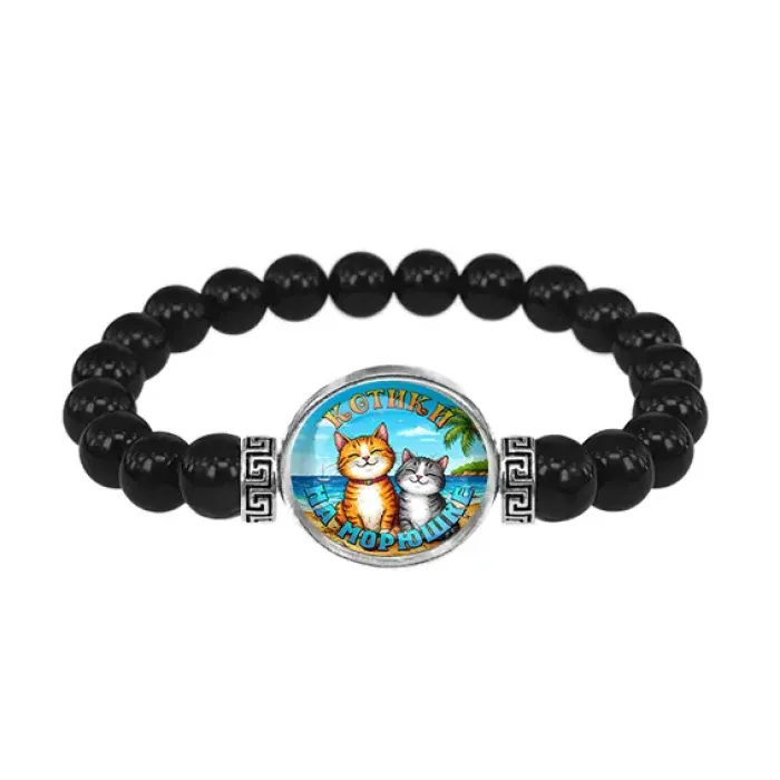 Стрейч-браслет из натурального чёрного агата с декоративным элементом под стеклянной линзой.