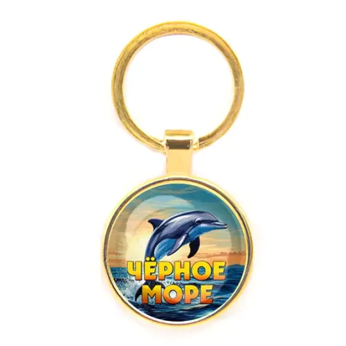 Круглый брелок из бижутерного сплава с золотым покрытием и стеклянной линзой, с изображением Черного моря.