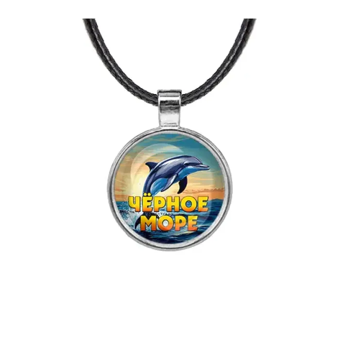Кулон из бижутерного сплава в цвете серебра с декоративным элементом «Черное море» и стеклянной линзой.